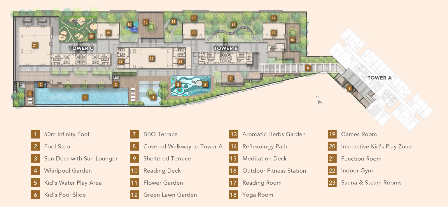 The Maple Residences is cleverly designed to appease residents from each tower. A variety of facilities are dotted all over the premise on Ground Level and Level 7. These walkable garden decks add much in the way of quality of life, as well as beautiful spaces that help integrate the communities that coexist within.